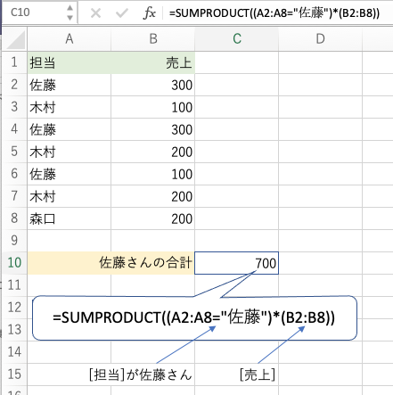 A列に担当があり、B列に売上がある表で、佐藤さんの 売上 合計を求める例です