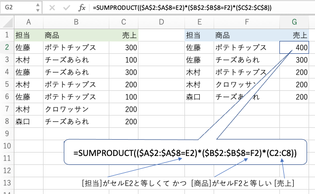 結果、セルE2に入力された 佐藤 さんのセルF2に入力された ポテトチップス の 売上 の 合計 400 が返されます