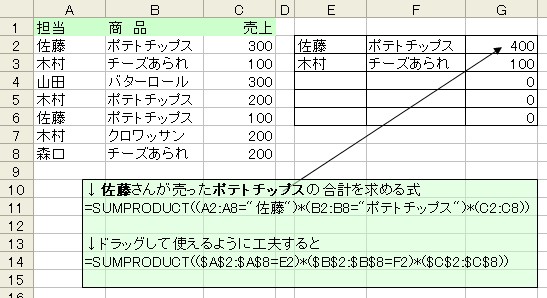 =SUMPRODUCT((A2:A8="佐藤")*(B2:B8="ポテトチップス")*(C2:C8))