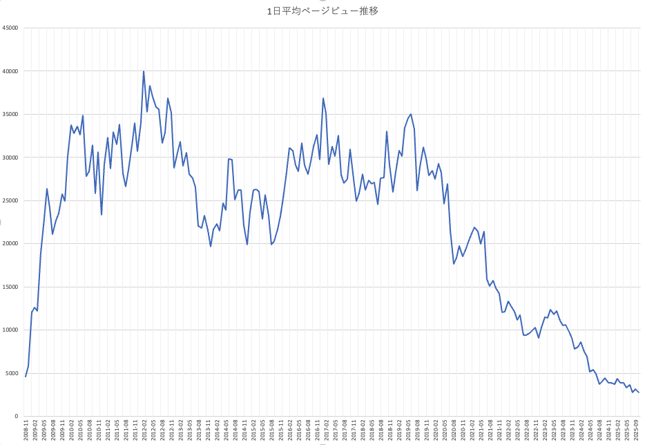2008/11〜2025/10 の当サイト訪問者数(PV)・推移